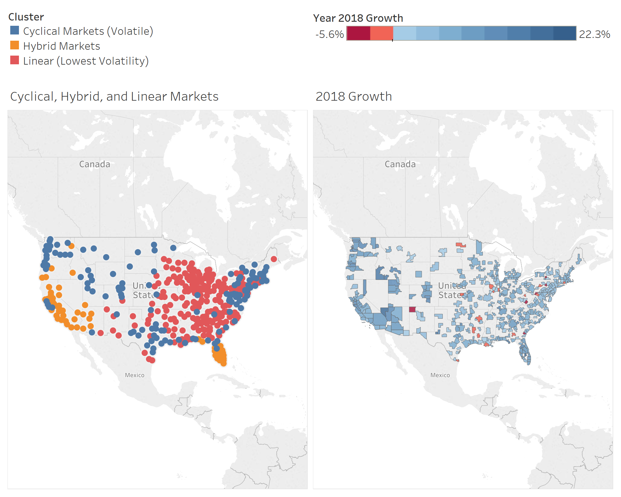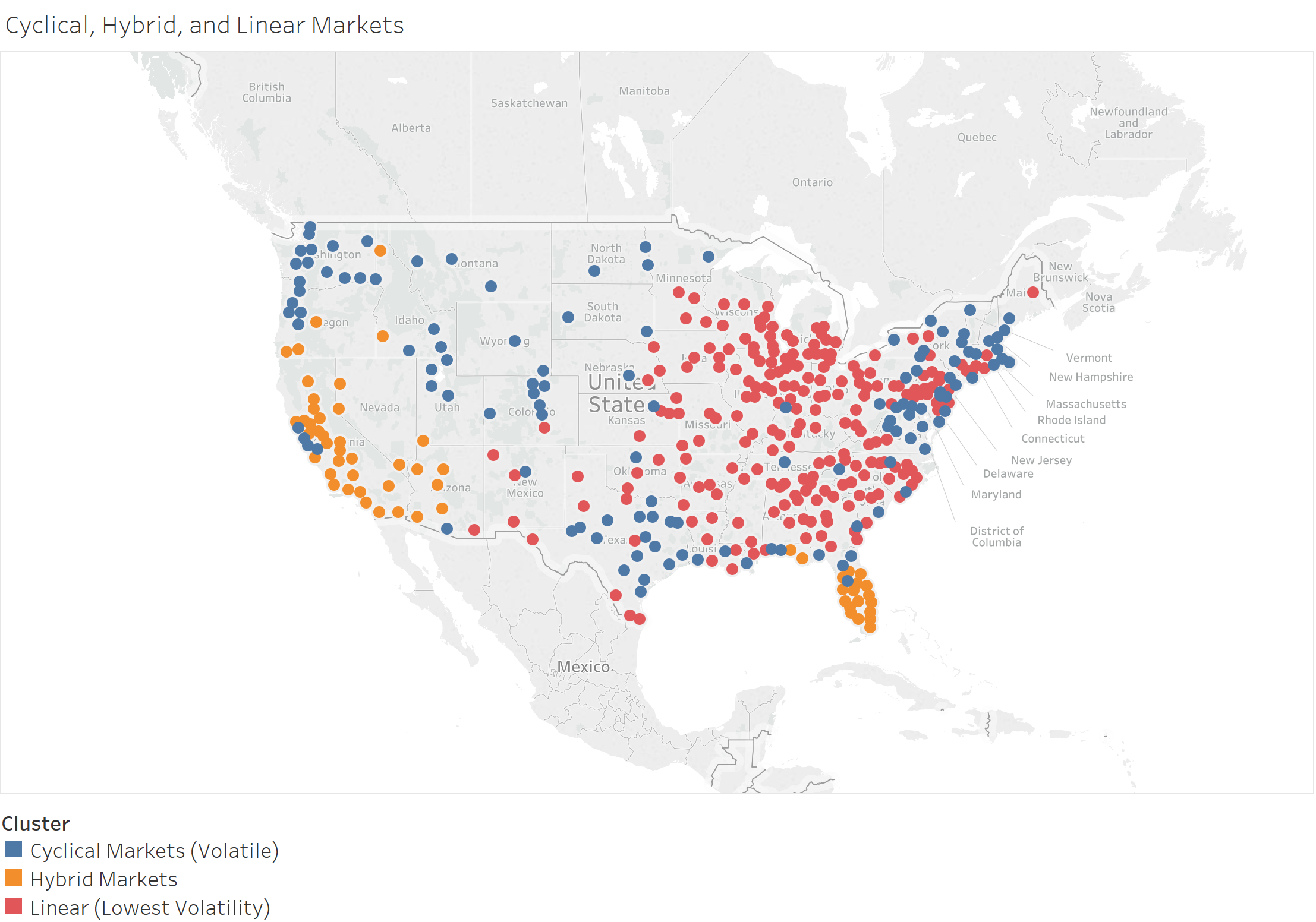 In blue are the cyclical markets.  In red are the linear markets.  In orange are the hybrid markets.  Outside of Texas, most of the South, Midwest, and Rust Belt contain linear markets.