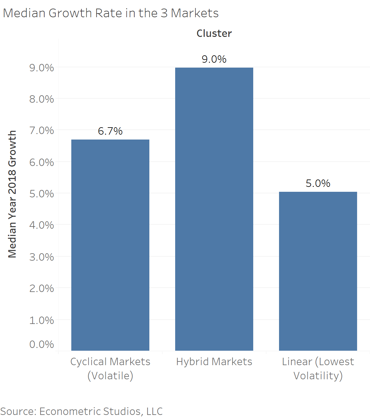 In looking at the performance of linear, cyclical, and hybrid markets, the category that had the best performance in 2018 was the hybrid market.  During 2018, the hybrid market saw median home price appreciation of 9.0%.  This surpassed the cyclical (6.5%) and linear markets (5.0%).