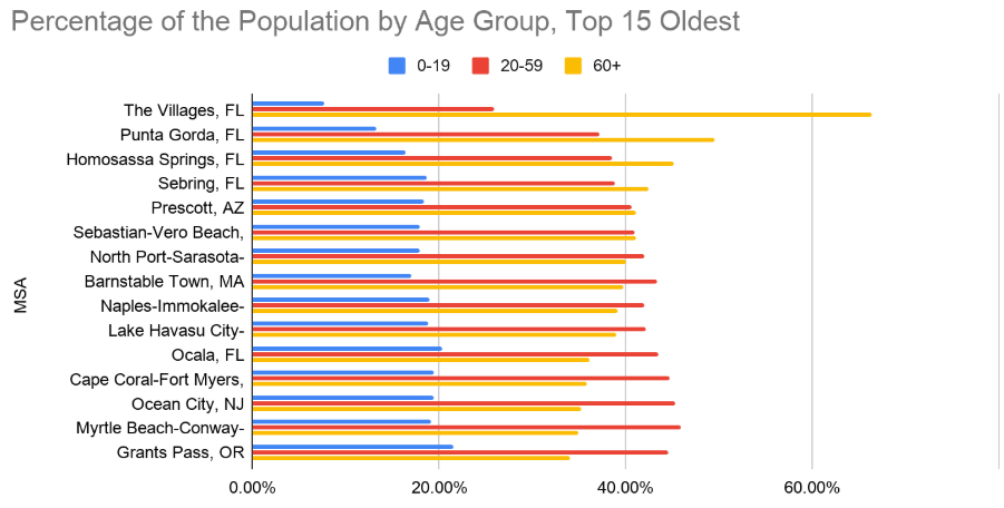 Interestingly, the top four spots are in Florida: The Villages, Florida; Punta Gorda, Florida; Homosassa, Florida; and Sebring, Florida. The 60+ population in these areas are 66.4%/49.6%/45.1%/42.4%.