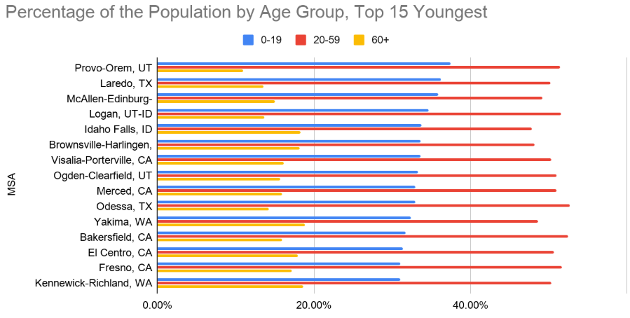 The youngest MSA is the Provo-Orem area in Utah with 37.5% of its population under 20. The Provo-Orem area is followed by Laredo, TX with 36.3% and McAllen-Edinburg at 35.9%.