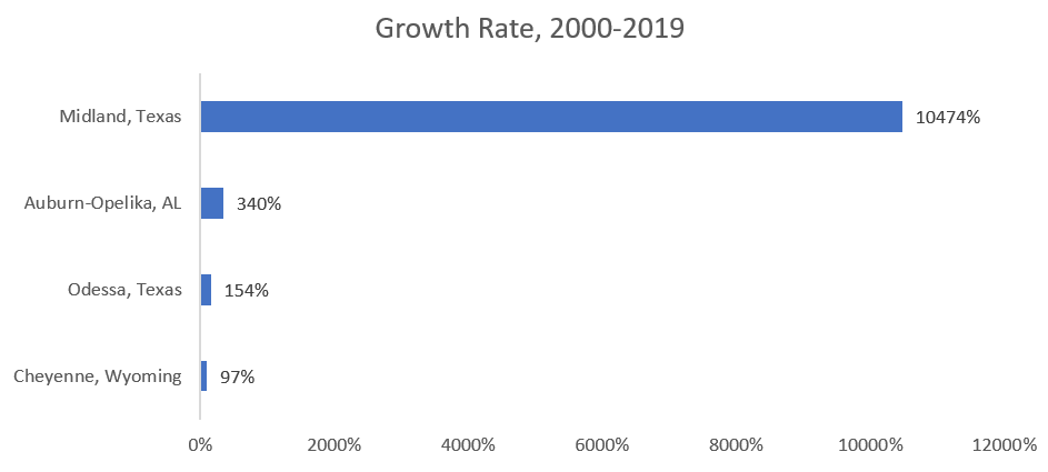 Interestingly, the top 4 from 2000 to 2019 (monthly sum) were Midland, Texas; Auburn-Opelika, Alabama; Odessa, Texas; and Cheyenne, Wyoming.